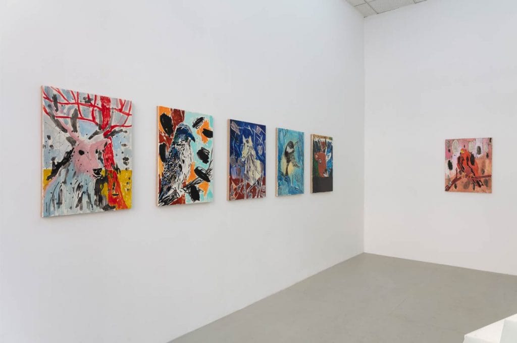 The combination with old habits back in the studio ultimately creates the hybrid form that is now on show. Characterized by the canvases that are almost ground down to paper – with champagne chalk and rabbit-skin glue as a primer – serving as an analogue to the sketchpad, his flat use of colour, ink quill and the animal motifs immediately create a clear framing that, however, does not detract from the naivety of the works. They provide enough structure for the eye to glide, rather than getting lost in the open lines and general playfulness.