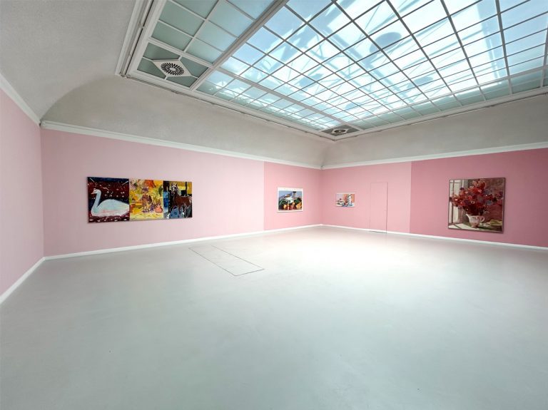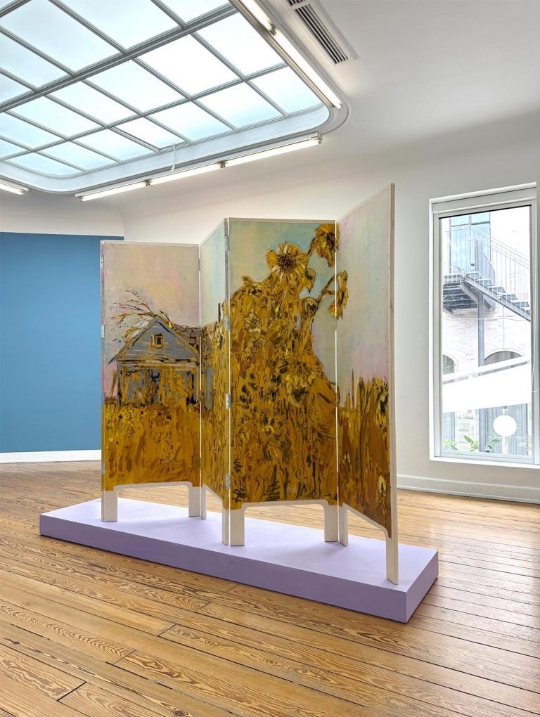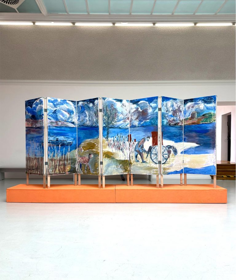 Zwei raumfüllende Paravents im Oberlichtsaal des Kunstvereins Konstanz sind zentraler Bestandteil der Ausstellung EVEN ISLANDS ARE CONNECTED. Die gemeinsame Arbeit von Timur Lukas und Laurentius Sauer lässt eine skulpturale Ebene als dreidimensionales Bild im Raum entstehen. Ergänzt durch die von den beiden Künstlern farbig gestalteten Wände werden die Räume des Kunstvereins zu einem eindrucksvoll erlebbaren Gesamtkunstwerk.